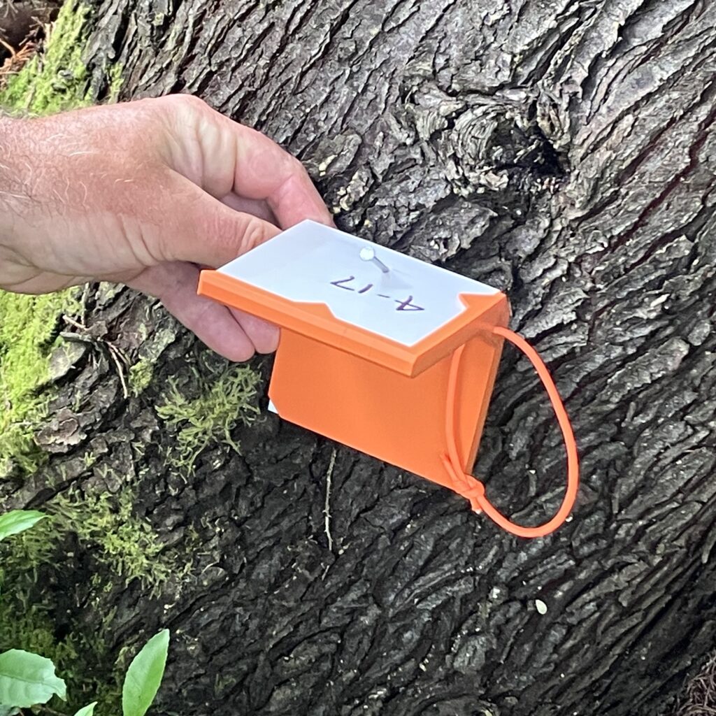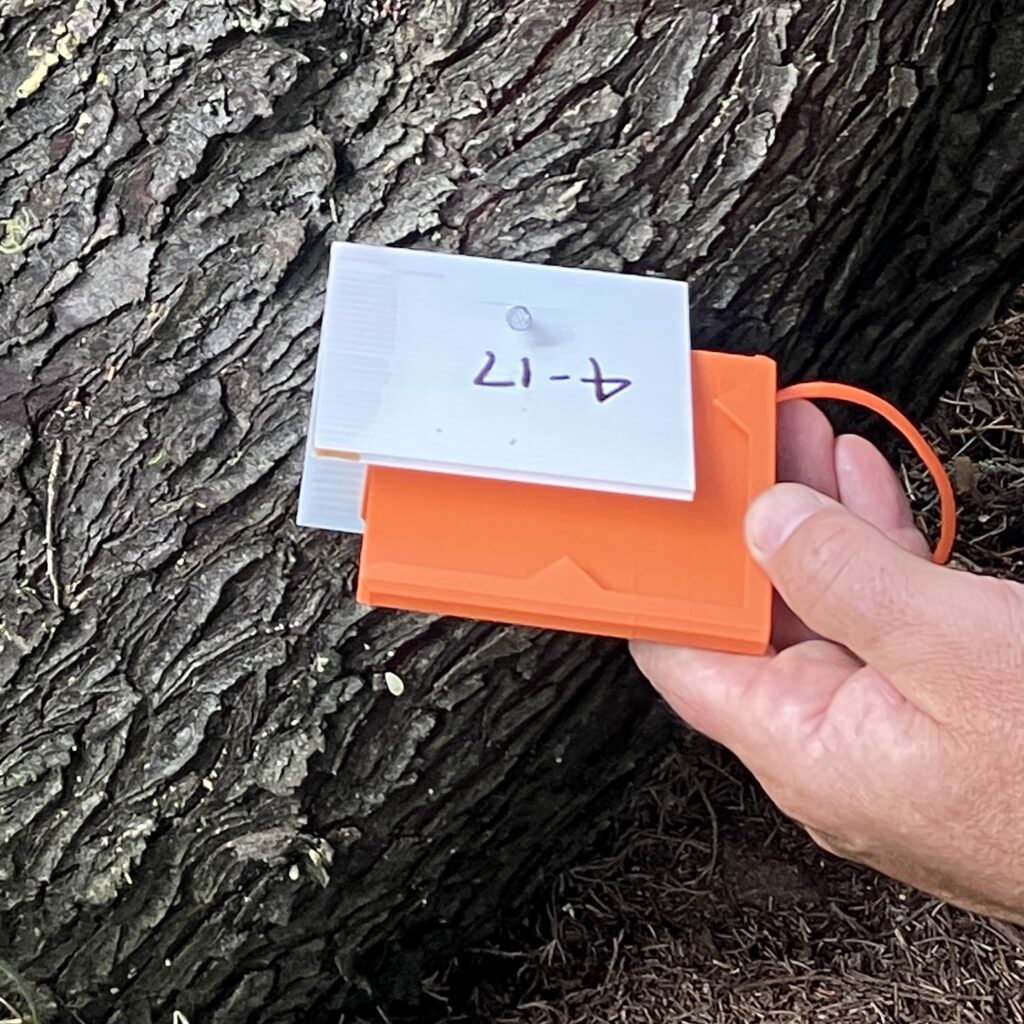 The folder helps the top of the card sit at a 90° angle on trees, improving consistency and repeatability across monitoring sites.